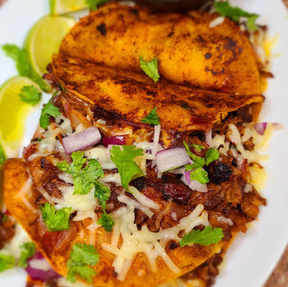 18. Form tacos or quesadillas. Dip a tortilla into the consommé and then place it on the griddle. Add meat, followed by cheese, cilantro, and onion. Add more consommé. Let it cook for 45-60 seconds before flipping! *It will fall apart if your griddle is not hot enough or your tortilla is drowning in consommé! Stay calm and collected. Don't panic or freak out. It's much easier to make quesadillas over tacos for your first time.